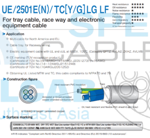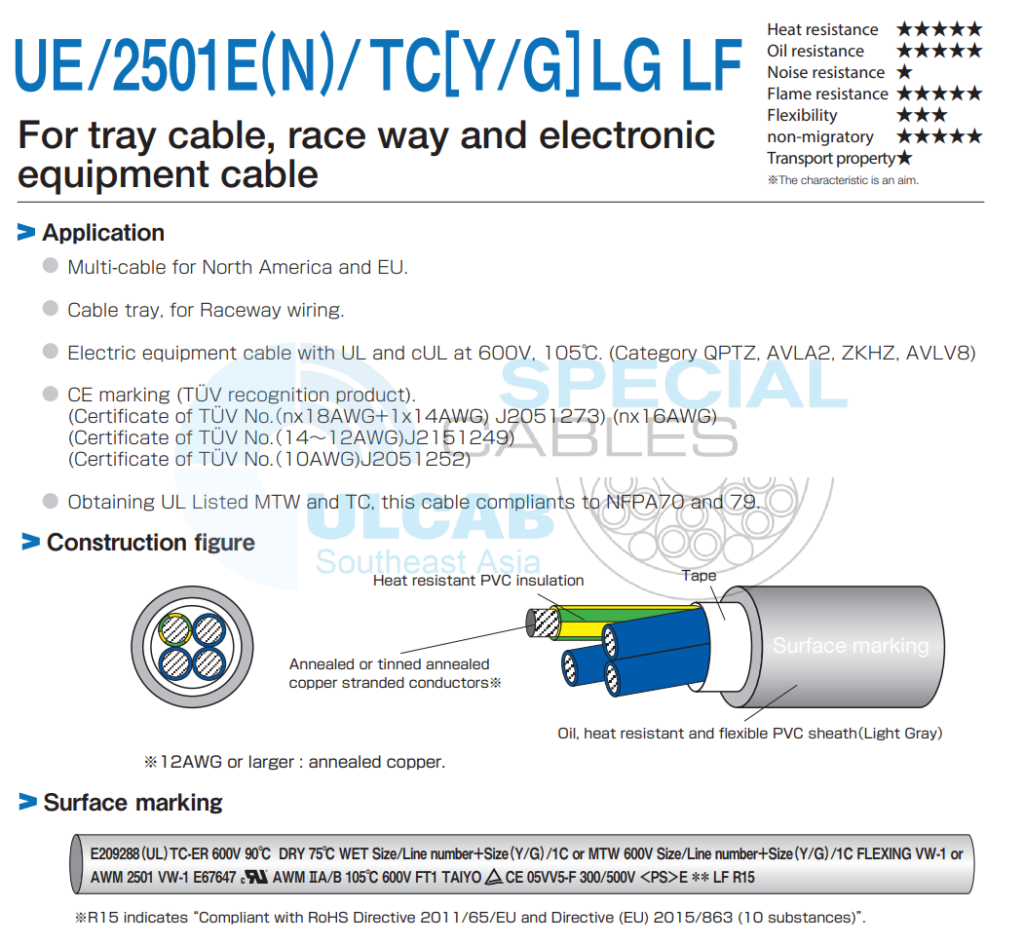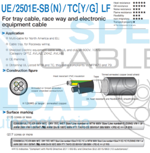 Dây cáp điện và điều khiển tín hiệu TAIYO UE/2501E(N)/TC[Y/G]LG LF thuộc nhóm cáp công nghiệp tiêu chuẩn UL/CE, dùng rất phổ biến trong hệ thống điện – điều khiển. được sử dụng Ruột dẫn: đồng mềm hoặc đồng mạ thiếc (tăng chống oxy hóa). Tiết diện: khoảng 0.75 –...