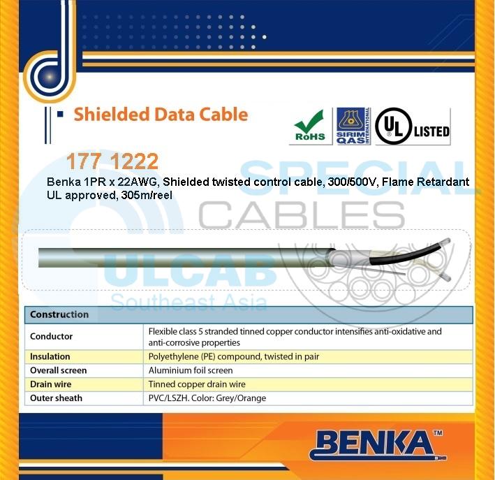 “177 1222” Cáp Tín Hiệu Benka 1Pair 22AWG TCU/PE/OSCR/PVC, Grey, 305m | Chính Hãng – Chống Nhiễu – Chống Bén Cháy