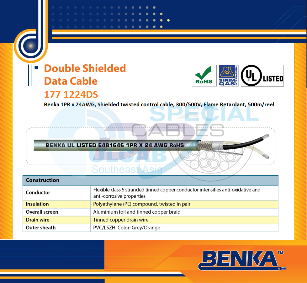 “177 1224DS” Cáp RS485 Benka 1Pair 24AWG TCU/PE/OSCR/PVC, Grey, 500m | Chính Hãng – Chống Nhiễu – Chống Bén Cháy