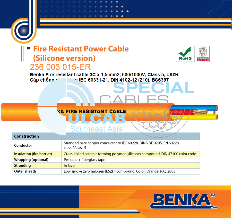 “236 003 015-ER” Cáp Chống Cháy Benka 3C x 1.5 mm2 Cu/Silicon/LSZH, Orange, 500m | Chống Cháy – Chính Hãng – Giá Tốt Nhất