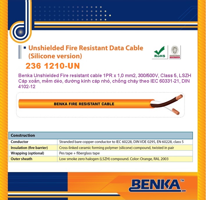 “236 1210-UN” Cáp Chống Cháy Benka 1PR x 1.0 mm2 Cu/Silicon//LSZH, Orange, 500m | Cáp xoắn – chống cháy – Chính Hãng – Giá Tốt Nhất