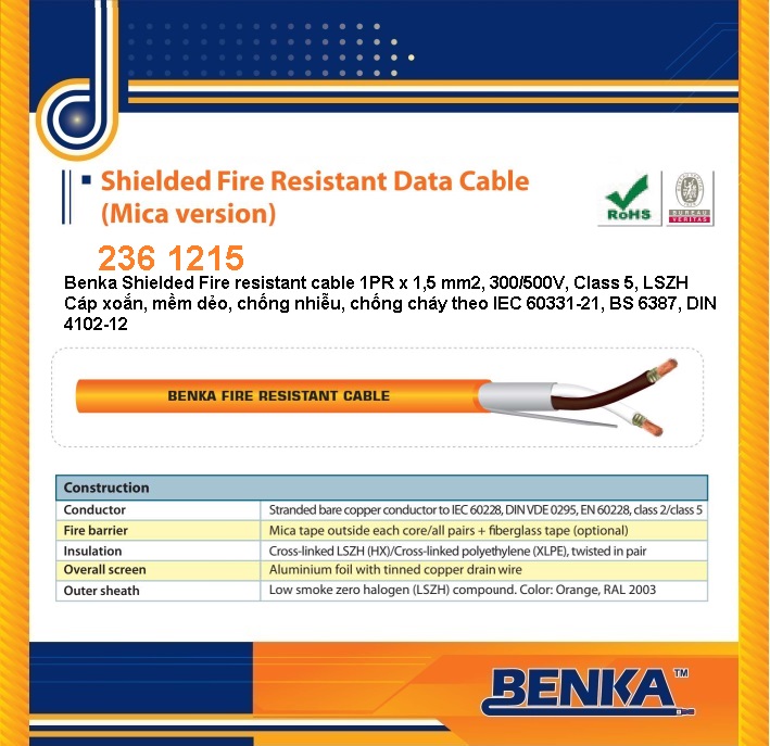 “236 1215” Cáp Chống Cháy Benka 1PR x 1.5 mm2 Cu/MICA/OSCR/LSZH, Orange, 500m | Cáp xoắn – chống nhiễu – chống cháy – Chính Hãng – Giá Tốt Nhất