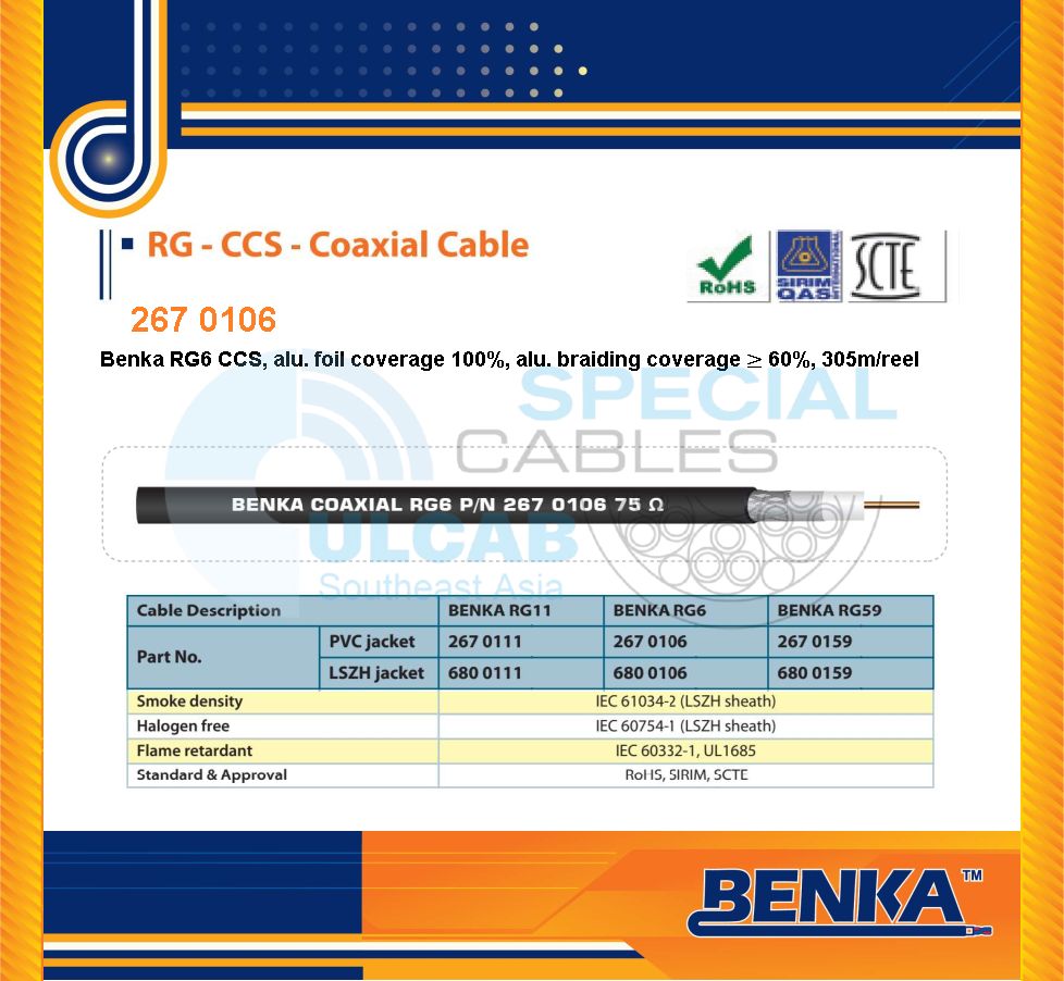 | 267 0106 | 267 0106 Benka RG6 CCS, alu. foil coverage 100%, alu. braiding coverage ≥ 60%, (305m/roll) |