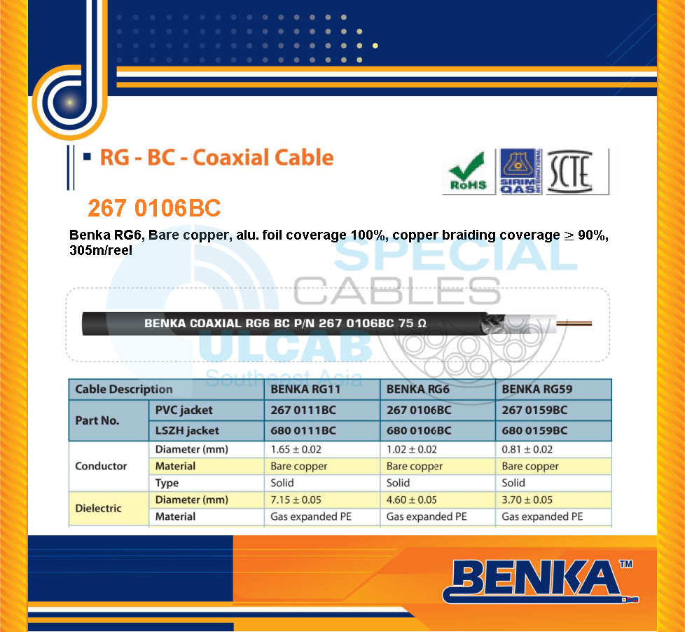 “267 0106BC” Benka RG6, Bare copper, alu. foil coverage 100%, copper braiding coverage ≥ 90%, (305m/roll) | Chống Nhiễu – Chính Hãng – Giá Tốt Nhất