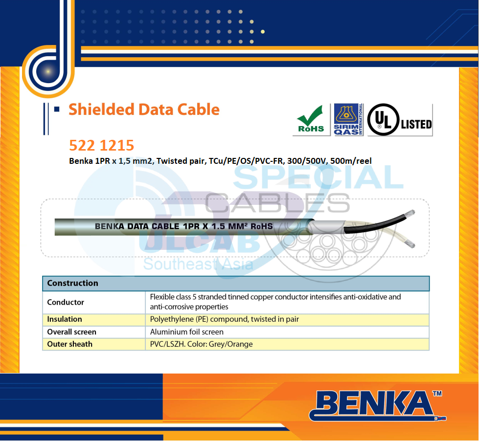 “522 1215” Cáp Tín Hiệu Benka 1Pair 1.5mm2 TCU/PE/OSCR/PVC, Grey, 500m | Chính Hãng – Chống Nhiễu – Chống Bén Cháy