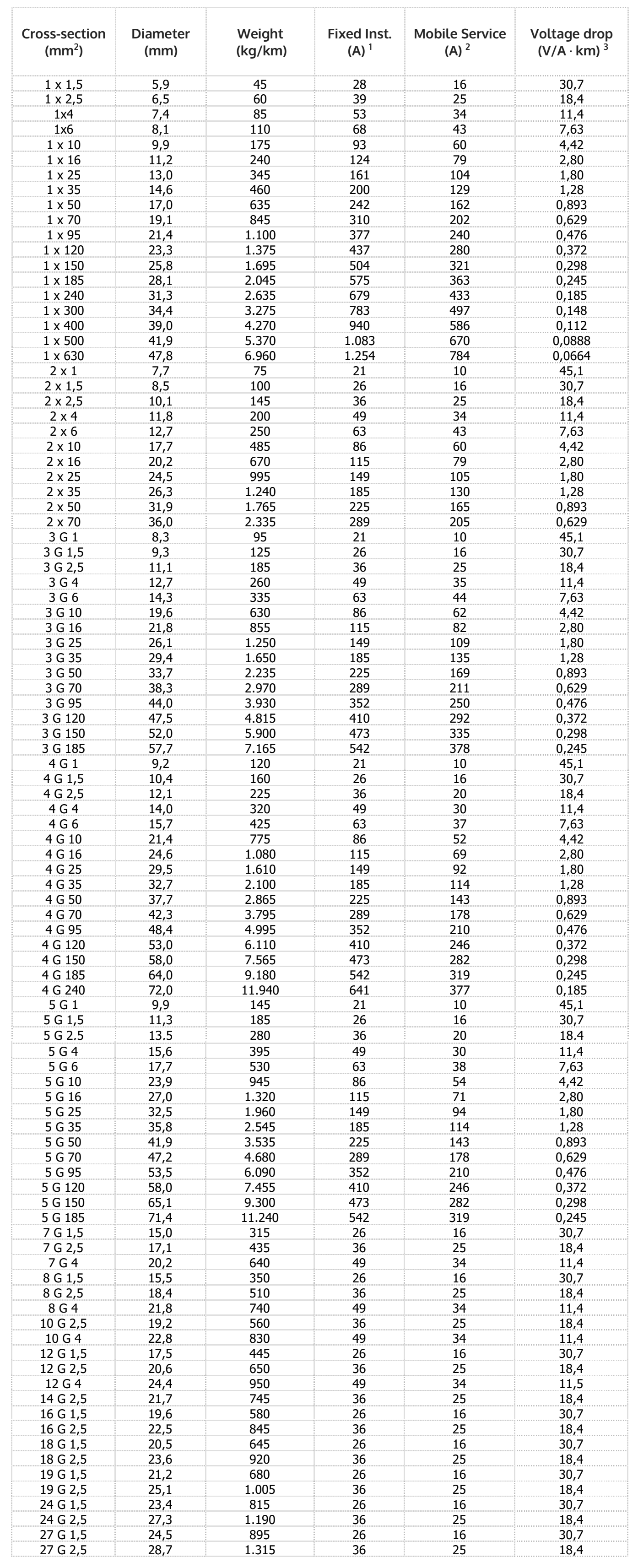 2 One cable in open air at 30°C ambient temperature according to EN 50565. For cables having 4 or 5 cores, it is supposed a three-phase circuit. For the rest of the cables it is supposed a single-phase circuit.