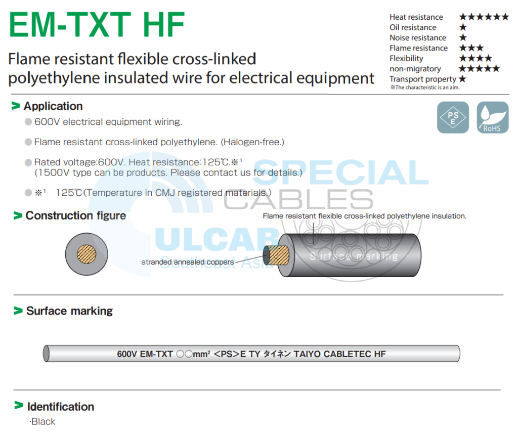 Dây cáp điện và điều khiển tín hiệu lõi đơn TAIYO EM-TXT HF 600V 125℃ được sử dụng dây dẫn đồng ủ mềm dẻo; Size 5.5 – 100mm2; Cách điện: Polyetylen liên kết chéo mềm dẻo chống cháy không chứa halogen, Lượng khói thoát ra thấp. Bán kính uốn tối thiểu là 2D. Màu: Black.