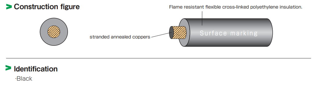 Dây cáp điện và điều khiển tín hiệu lõi đơn TAIYO EM-TXT HF 600V 125℃ được sử dụng dây dẫn đồng ủ mềm dẻo; Size 5.5 – 100mm2; Cách điện: Polyetylen liên kết chéo mềm dẻo chống cháy không chứa halogen, Lượng khói thoát ra thấp. Bán kính uốn tối thiểu là 2D. Màu: Black.