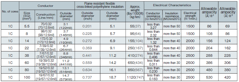 ※² Allowable current for inside equipment use.(Permissible conductor temperature is 125℃.)