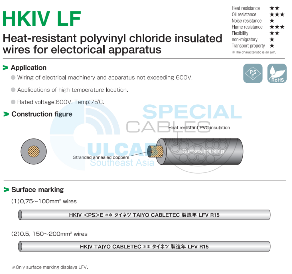 Dây cáp điện và điều khiển tín hiệu TAIYO HKIV LF được sử dụng dây dẫn đồng ủ; Size 0.5 – 200mm2; Cách điện: PVC chịu nhiệt; Màu: Light Blue – Xanh lam (RAL 5012) ; Brown – Nâu (RAL 8003) ; Black – Đen (RAL 9005) ; Red – Đỏ (RAL 3000) ; Green/Yellow – Xanh lục/vàng (RAL 1021 / RAL 6018) ; Grey – Xám (RAL 7000) ; Dark Blue – Xanh đậm (RAL 5010) ; White – Trắng (RAL 9010) ; Orange – Cam (RAL 2003) ; Purple – Tím (RAL 4005) ; Pink – Hồng (RAL 3015) ; Yellow – Vàng (RAL 1021) ; Green – Xanh lá (RAL 6018) ; Beige – Be (RAL 1001) .