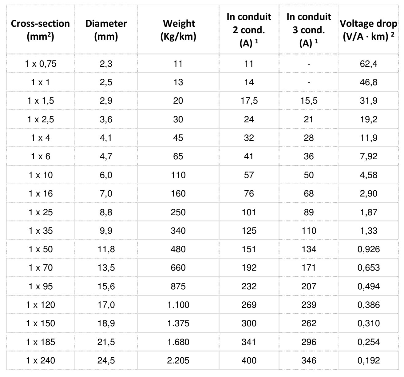 RATED VOLTAGE ES05Z1-K/H05Z1-K (up to 1 mm2): 300/500 V · H07Z1-K (from 1,5 mm2 onwards): 450/750 V.