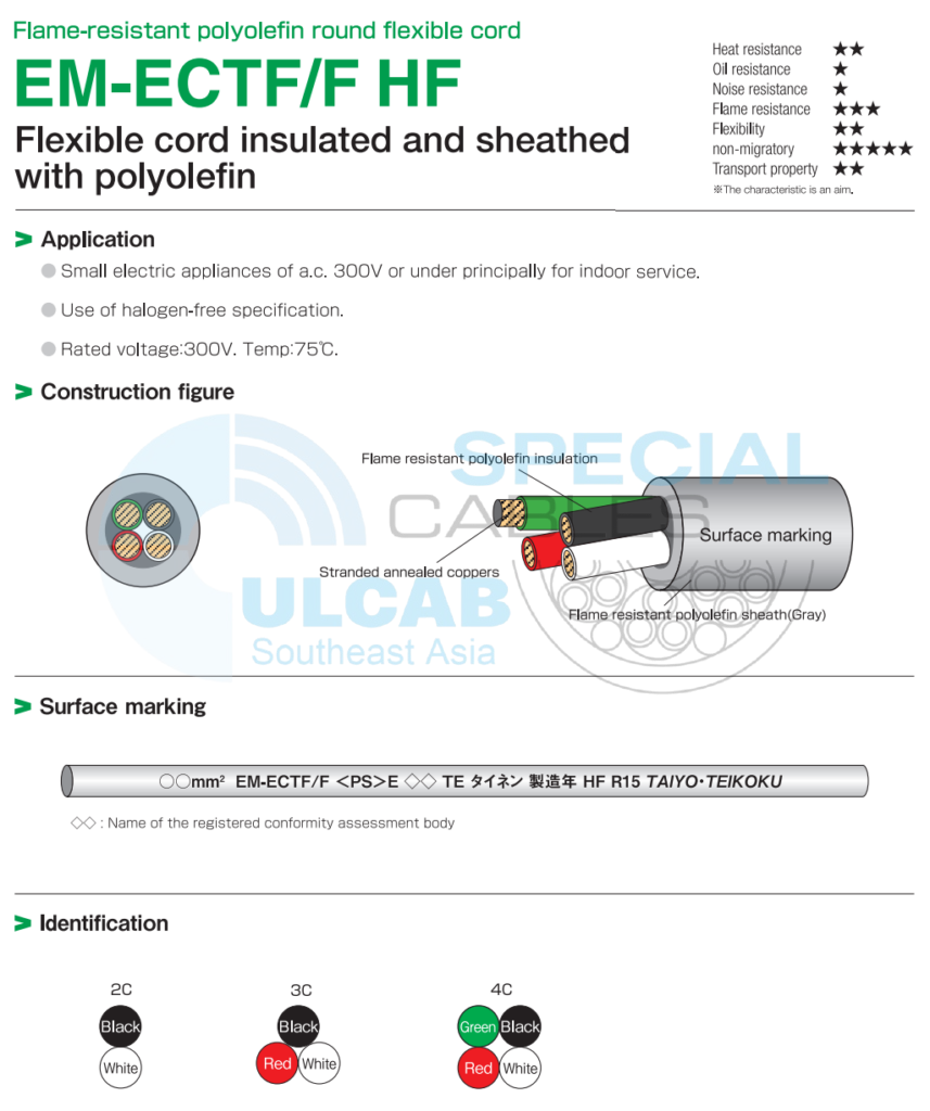 Dây cáp điện và điều khiển tín hiệu TAIYO EM-ECTF/F HF được sử dụng dây dẫn đổng ủ; Cách điện: polyolefin chống cháy; Vỏ bọc polyolefin chống cháy (Xám). Không chứa halogen, ít khói thải.