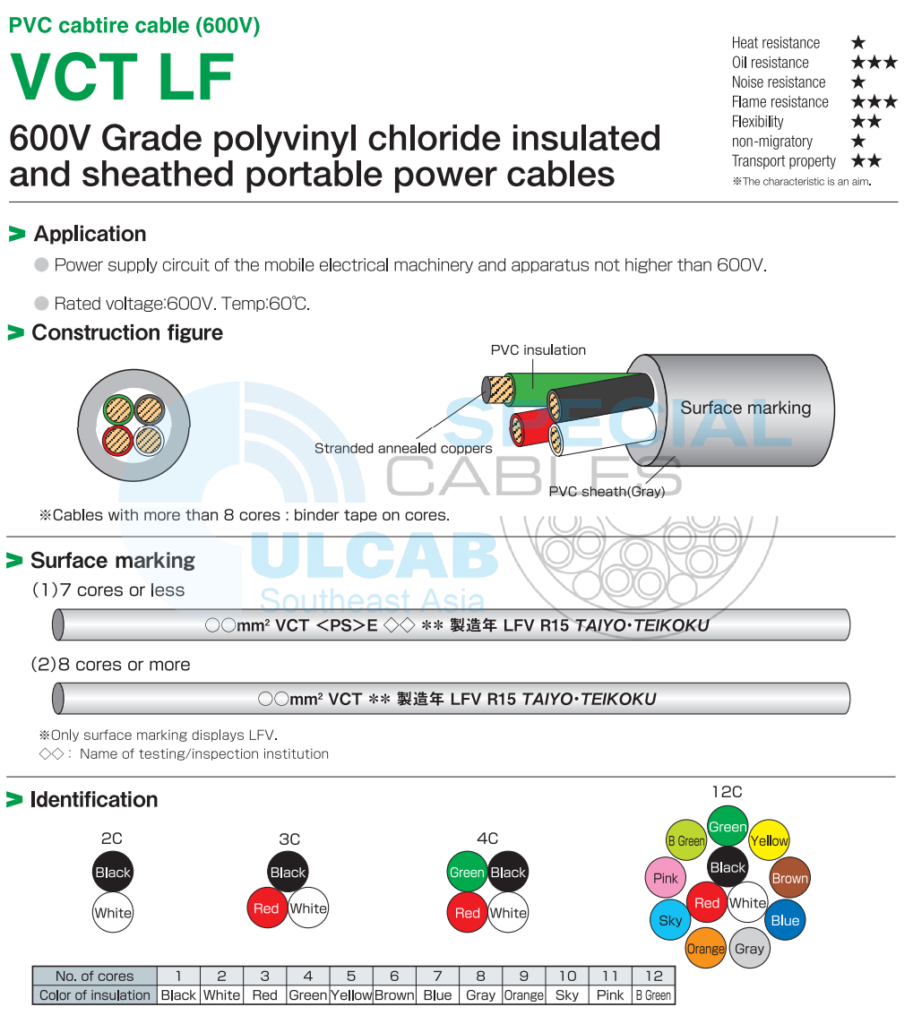 Dây cáp điện và điều khiển tín hiệu TAIYO VCT LF được sử dụng dây dẫn đồng ủ; Cách điện: PVC; Vỏ bọc ngoài: PVC; Màu vỏ: Xám; chống cháy, chống dầu.
