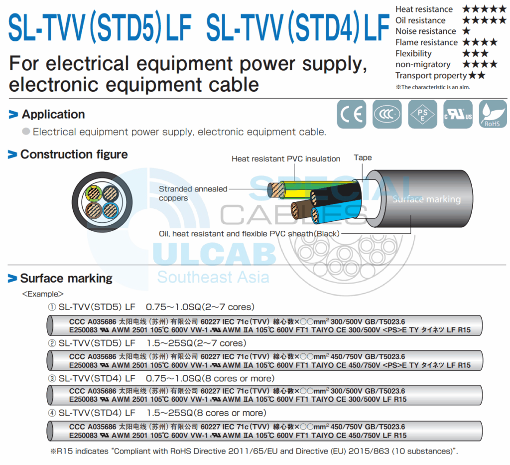 👉 Dây cáp điện và điều khiển tín hiệu TAIYO SL-TVV (STD5) LF / SL-TVV (STD4) LF 450/750V 70°C BLACK là lựa chọn phù hợp cho tủ điện, hệ thống điều khiển, máy móc công nghiệp và các ứng dụng yêu cầu cáp bền, linh hoạt và an toàn điện.