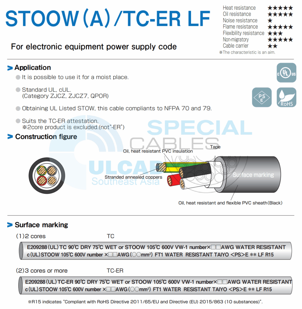 E209288 (UL) TC-ER 90°C DRY 75°C WET or STOOW 105°C 600V VW-1 number× AWG (○○mm²) WATER RESISTANT c(UL) STOOW 105°C 600V number × AWG (○○mm²) FT1 WATER RESISTANT TAIYO <PS>E ** LF R15