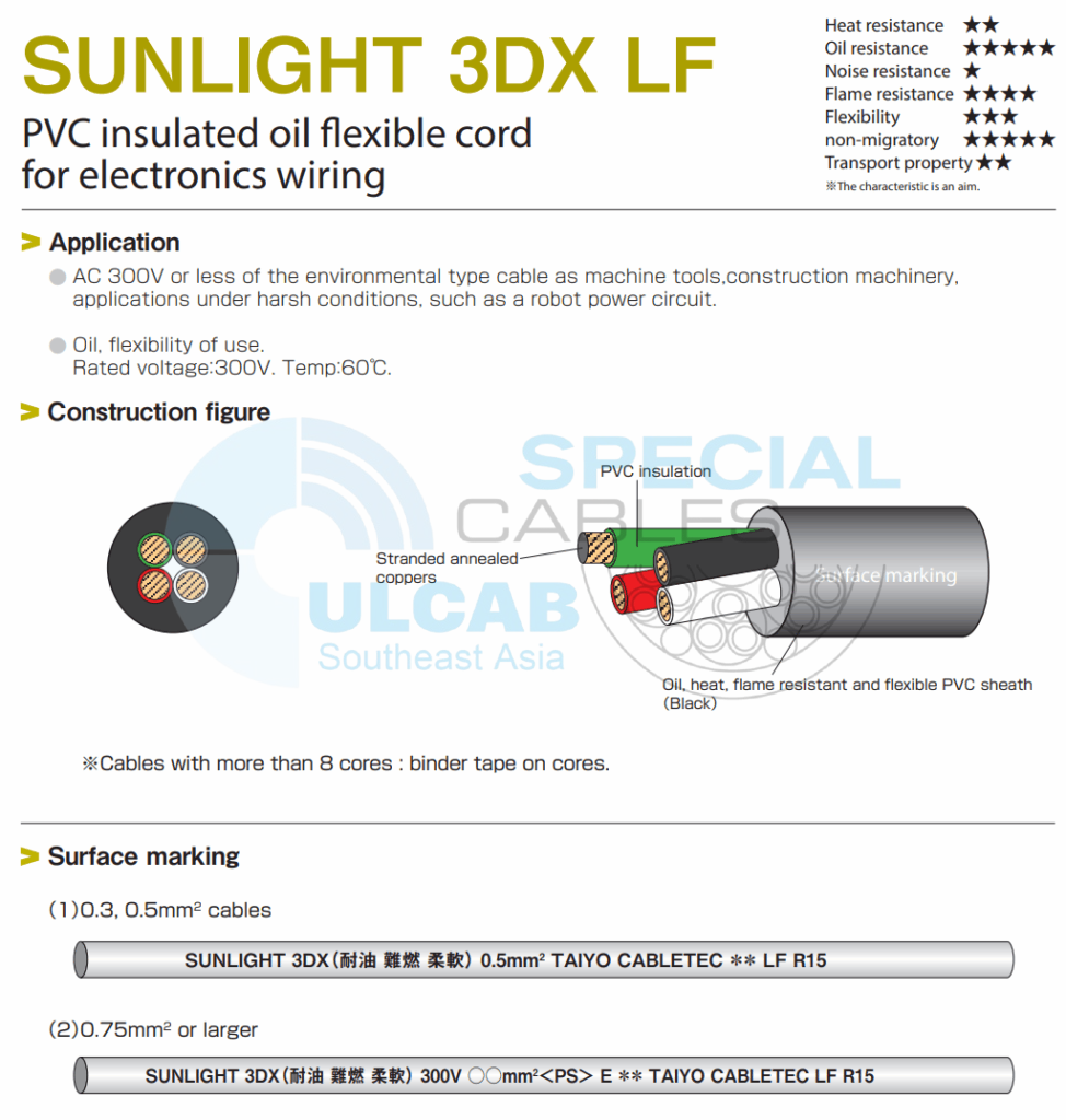 Dây cáp điện và điều khiển tín hiệu TAIYO SUNLIGHT 3DX LF 300V 60°C được sử dụng dây dẫn đồng ủ; Size 0.5 – 2mm2; Vật liệu cách điện: PVC; Vỏ ngoài: PVC mềm chống dầu, nhiệt, chống cháy UL VW-1, chống hóa chất, nước, mài mòn, lạnh. Vật liệu vỏ bọc không di chuyển so với nhựa ABS và PS. Màu đen