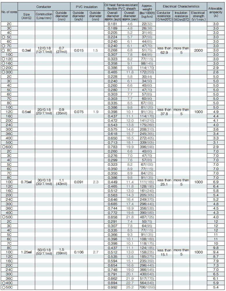 ・The allowable ampacity of this catalog is a value at one in the air construction and the ambient temperature 30℃.