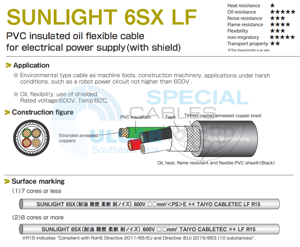 Dây cáp điện và điều khiển tín hiệu TAIYO SUNLIGHT 6SX LF 600V 60°C; được sử dụng dây dẫn đồng ủ; Size 0.75 – 38mm2; Vật liệu cách điện: PVC; Tape; Chống nhiễu: Lưới đồng ủ mạ thiếc; Vỏ ngoài: PVC chịu dầu, chịu nhiệt, chống cháy, chống hóa chất, nước, mài mòn, chịu lạnh và mềm dẻo; Màu: đen.