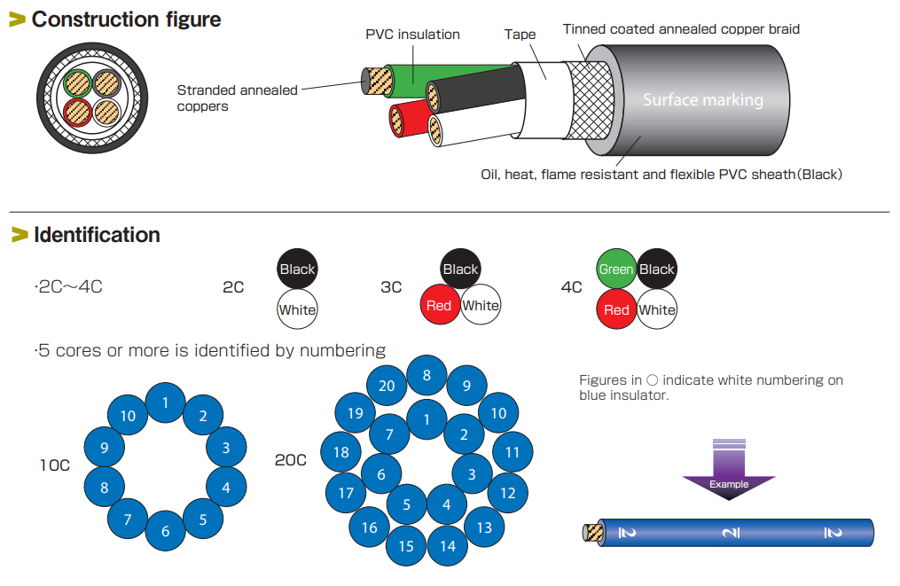 Dây cáp điện và điều khiển tín hiệu TAIYO SUNLIGHT 6SX LF 600V 60°C; được sử dụng dây dẫn đồng ủ; Size 0.75 – 38mm2; Vật liệu cách điện: PVC; Tape; Chống nhiễu: Lưới đồng ủ mạ thiếc; Vỏ ngoài: PVC chịu dầu, chịu nhiệt, chống cháy, chống hóa chất, nước, mài mòn, chịu lạnh và mềm dẻo; Màu: đen.