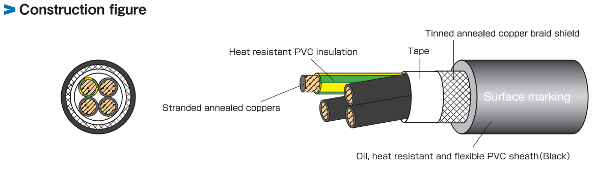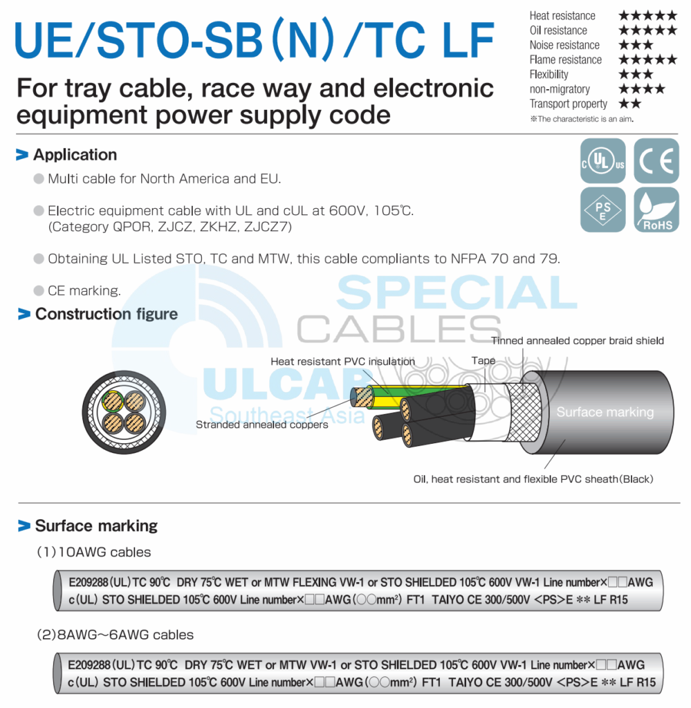 Dây cáp điện và điều khiển tín hiệu TAIYO UE/STO-SB(N)/TC LF 600V 105°C BLACK được sử dụng dây dẫn bằng đồng ủ; Size: 0.75 – 30mm2; Vật liệu cách điện: PVC chịu dầu và nhiệt; Chống nhiễu: Lưới đồng bện mạ thiếc; Vỏ ngoài: PVC chịu dầu, chịu nhiệt và mềm dẻo. Đạt Thử nghiệm ngọn lửa khay dọc của UL (Vỏ màu đen).