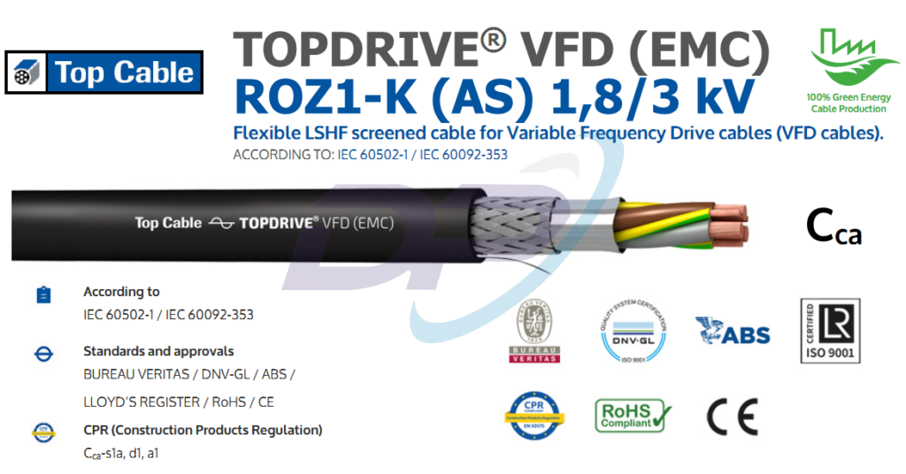 Cáp TOPDRIVE VFD (EMC) ROZ1-K (AS) 1,8/3kV được thiết kế đặc biệt cho Động cơ truyền động tần số thay đổi và các hệ thống lắp đặt cần hạn chế ảnh hưởng của nhiễu điện từ (EMI).