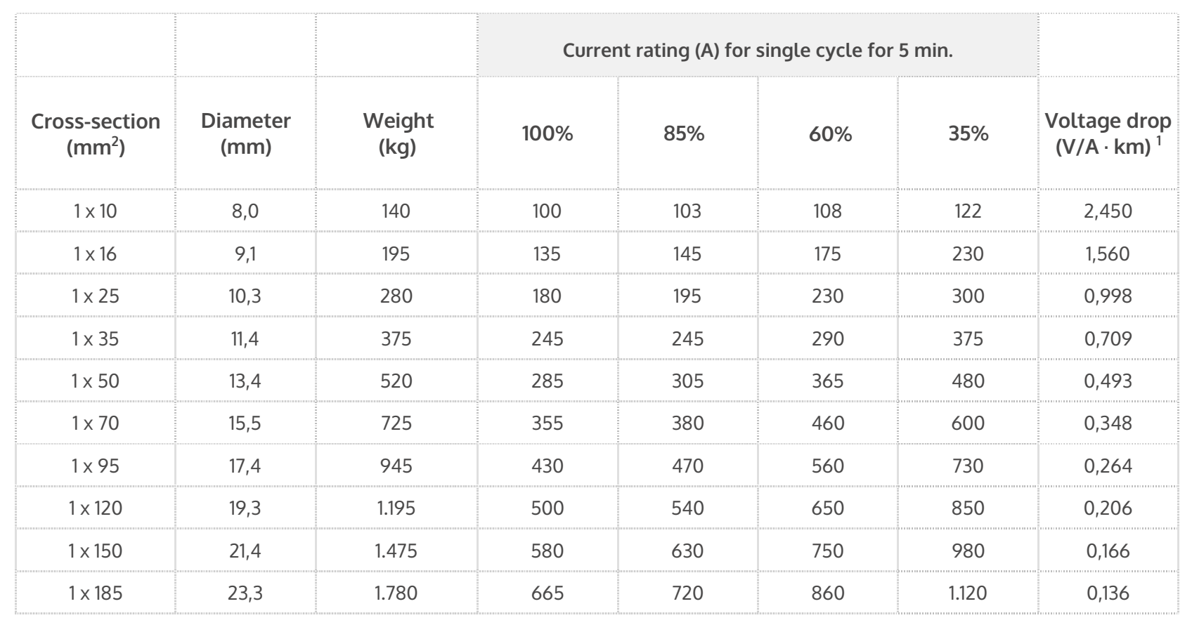 1 For 10 metres of cable carrying 100 A. At 85°C conductor temperature and for direct current.