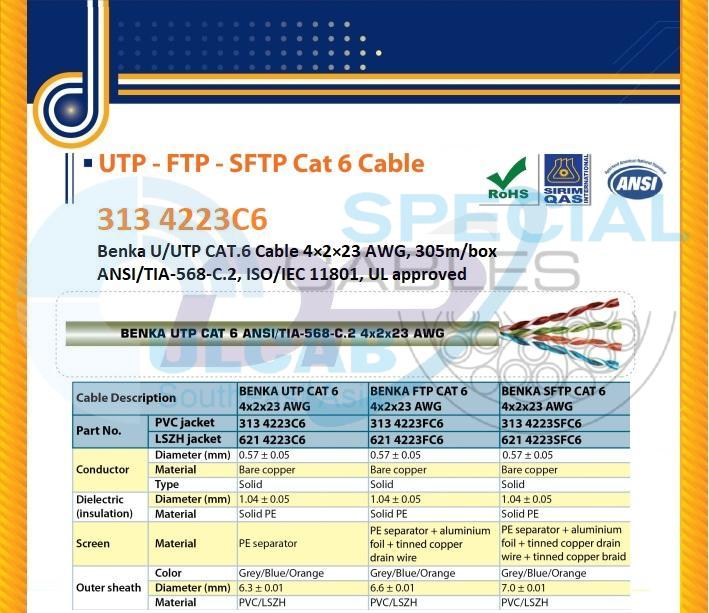 Cáp Mạng BENKA ( 313 4223C6 ) Benka U/UTP CAT.6 Cable 4×2×23 AWG, 305m/box | Chính Hãng – Cáp Mềm – Giá Tốt Nhất