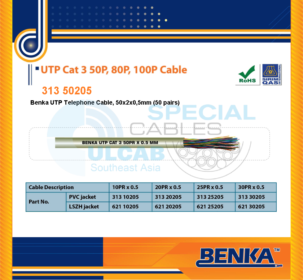 | 313 50205 | 313 50205 Benka UTP Telephone Cable, 50x2x0,5mm (50 pairs) |