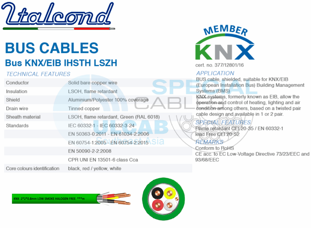 Dây cáp tín hiệu và điều khiển ITALCOND (ITAL356) EIB/KNX BUS được sử dụng Vật liệu dây dẫn: dây đồng trần (solid) Ø 0,8 mm, Cách điện lõi: LSOH, flame retardant, các lõi được đánh đấu bằng màu Đỏ, Đen, Trắng, Vàng, Lõi xoắn thành quad, Chống nhiễu Aluminium/Polyester 100% coverage, với dây thoát nhiễu đồng mạ thiếc, Vỏ bọc bên ngoài: LSOH, flame retardant, Green (RAL 6018).