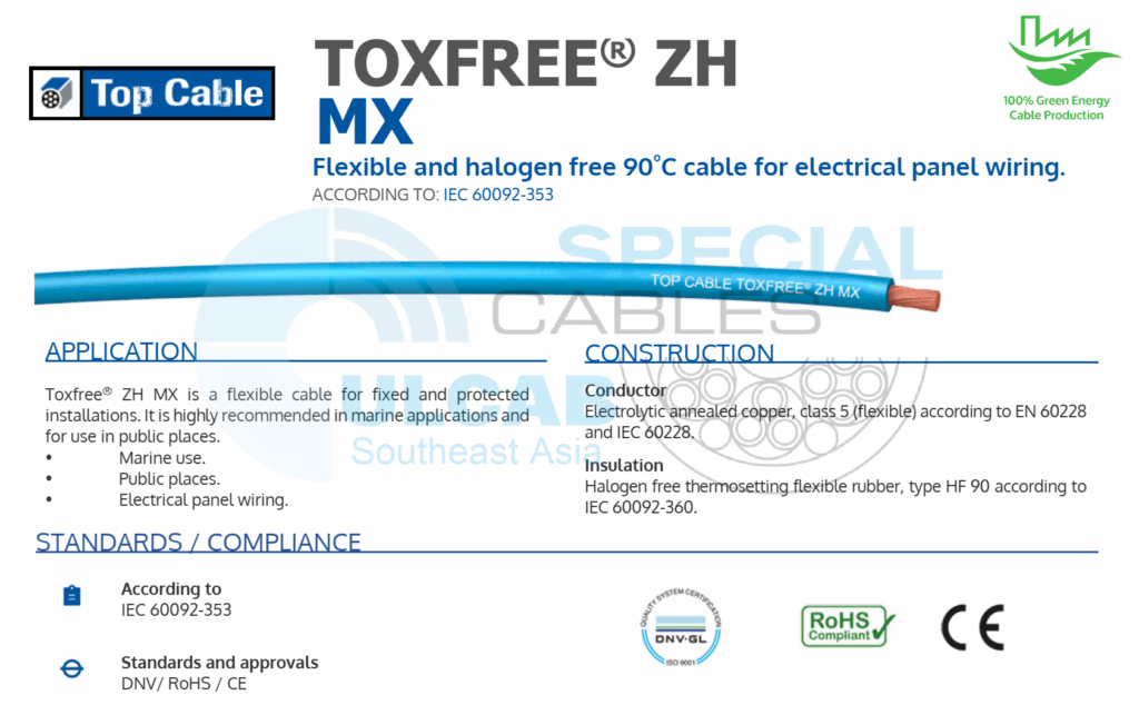 Dây cáp điện và điều khiển tín hiệu Single core TOP CABLE TOXFREE ZH MX 90ºC được sử dụng dây dẫn Đồng ủ điện phân, loại 5 (dẻo) theo tiêu chuẩn EN 60228 và IEC 60228; Size: 1.0mm2 ; 1.5mm2 ; 2.5mm2 ; 4mm2 ; 6mm2; Cách điện: Cao su nhiệt rắn mềm không chứa halogen, loại HF 90 theo tiêu chuẩn IEC 60092-360; Màu tiêu chuẩn: Nâu, Đỏ, Cam, Vàng, Xanh lá, Xanh dương, Tím, Xám, Trắng, Đen, Hồng, Xanh dương nhạt, Xanh lá/Vàng.