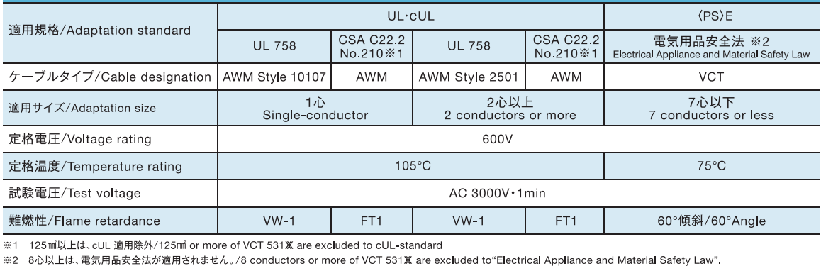 ・VCT cables designed to Electrical Appliance and Material Safety Law( 7 conductors or less) & UL・cUL standards