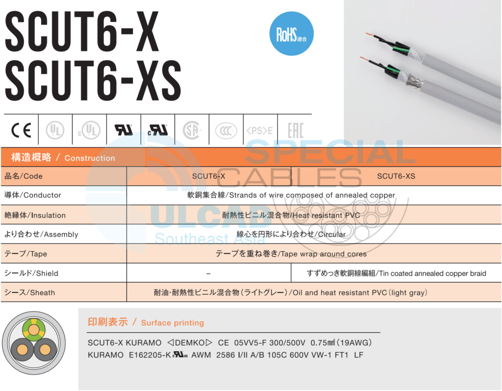 Dây cáp điện và điều khiển tín hiệu (moving cable) KURAMO SCUT6-X / SCUT6-XS được sử dụng Dây dẫn làm bằng đồng ủ, Cách nhiệt/Cách điện: PVC chịu nhiệt, Băng quấn quanh lõi, Shield/Lá chắn: Bện đồng ủ tráng thiếc với Model SCUT6-XS, Vỏ ngoài: PVC chịu dầu và chịu nhiệt (xám nhạt)