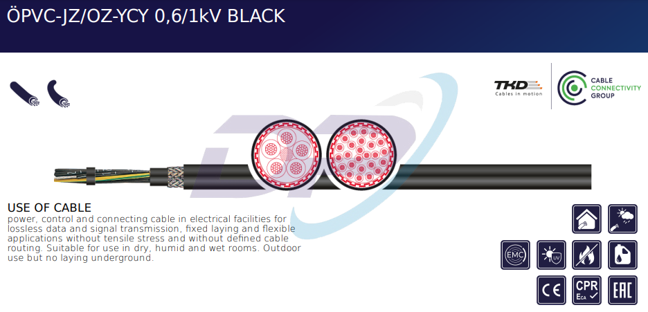 Dây cáp điện và điều khiển tín hiệu TKD KABEL ÖPVC-JZ/OZ-YCY 0,6/1kV BLACK được sử dụng Vật liệu dẫn điện: Sợi đồng trần Acc. đến IEC 60228 cl. 5, Cách nhiệt lõi: PVC, Chất liệu vỏ bên trong: PVC, Chống nhiễu: Dây bện bằng đồng đóng hộp, độ che phủ khoảng. 85%, Vỏ bọc bên ngoài: PVC, Màu vỏ: Đen, RAL 9005.