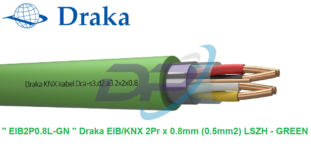 Dây cáp tín hiệu và điều khiển Draka EIB/KNX BUS 75 Ohm được sử dụng Vật liệu dây dẫn: dây đồng trần (solid) 0.80 mm Ø (tương đương 0.5 mm2 ), Cách điện lõi: PE, 1.6 mm Ø, các lõi mầu Đỏ, đen, trắng, vàng, Tấm chắn chống nhiễu tổng thể Lá nhôm nhiều lớp + dây thoát nhiễu bằng đồng 0,71 mm Ø (tương đương 0,4mm2), Vỏ ngoài LSZH mầu xanh lá cây RAL 6018.