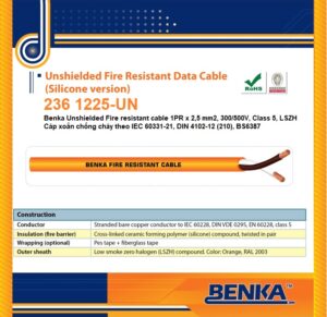 “236 1225-ER” Cáp Chống Cháy Benka 1PR x 2.5 mm2 Cu/Silicon/OSCR/LSZH, Orange, 500m | Cáp xoắn – chống nhiễu – chống cháy – Chính Hãng – Giá Tốt Nhất